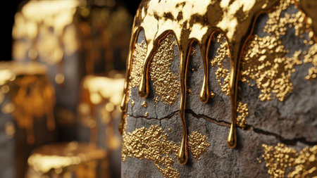 presents a close-up view of rough, cracked stone surfaces being covered and dripped with molten gold. The liquid gold flows and solidifies, creating a and opulent texture. The contrast between the coarse, grey stone and the shiny, metallic gold is striking. The detail of the drips and the texture of both are emphasized. The overall impression is one of wealth, luxury, and transformation, with a rich, shimmering aesthetic.