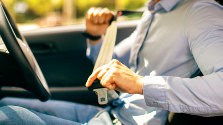 Close up of unrecognizable person fastening seatbelt while driving car, road safety concept, copy space