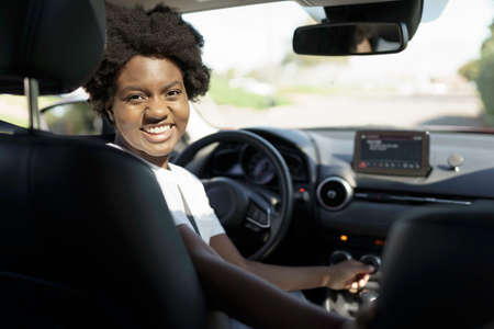 Young black woman sit on is first red car