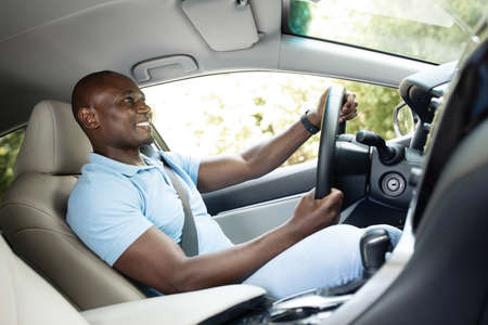 Joyful black man enjoying his new luxury car