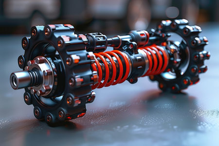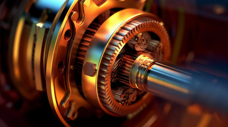 This image captures the intricate details of a mechanical component used in automotive engineering, showcasing vibrant colors and precision craftsmanship.
