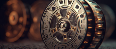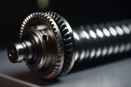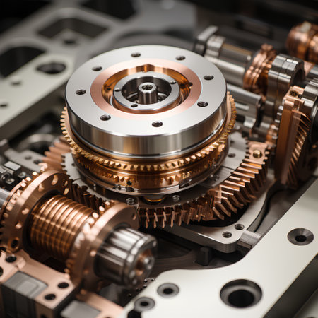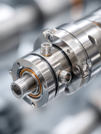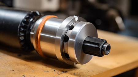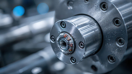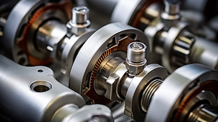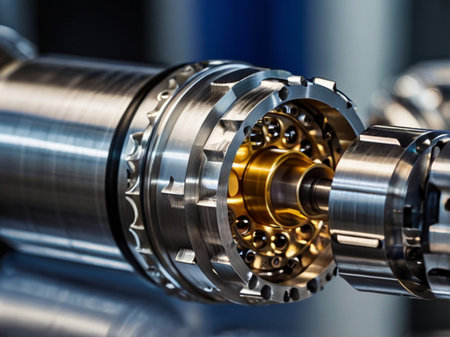 A close-up view of a precision engineering component, showcasing intricate metal textures and detailing, ideal for industrial and manufacturing contexts.