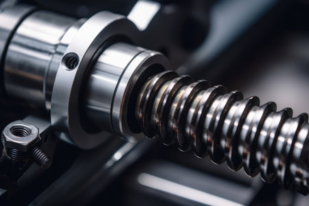 Macro shot of a ball screw in motion, with precise steel balls rolling inside the threaded shaft