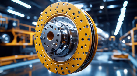 A detailed view of a precision brake disc used in automotive applications, showcased in a modern manufacturing facility highlighting advanced engineering and design.