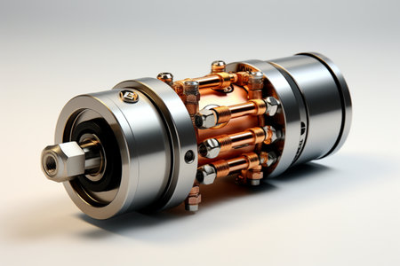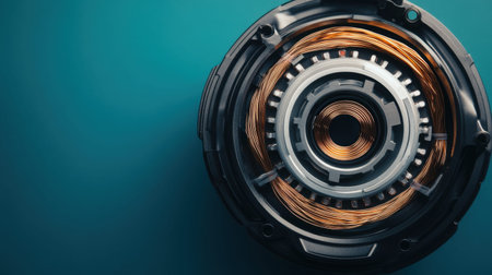 Intricate and precise design of an copper powerful motor. The round, toroidal stator are meticulously wrapped in copper wire, creating a visually stunning background. Generative AI