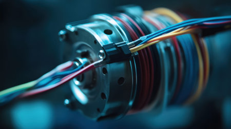 This close-up image showcases the intricate details of an electric motor, featuring vibrant wires and connections, highlighting the precision involved in modern technology.