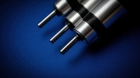 This image captures a close-up view of metallic tools featuring precision tips, set against a deep blue backdrop, ideal for industrial design.
