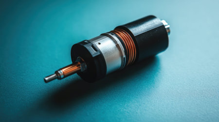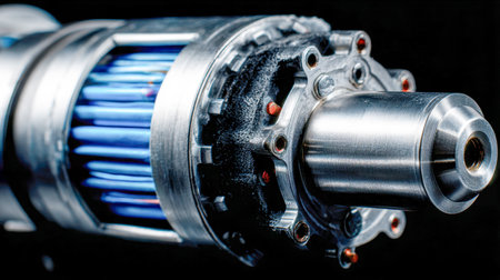 This image features a detailed close-up of an electric motor component, showcasing copper coils and a steel shaft against a blue background. Perfect for technology and engineering themes.