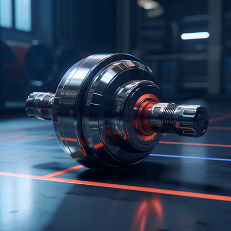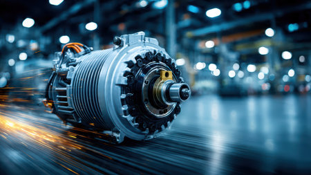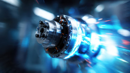 Close-up of high-tech electric motor with blue lighting and motion blur background.