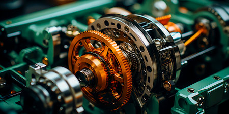 A close up of a machine with many gears and cylinders. Concept of complexity and precision, as the various parts work together to create a functioning machine