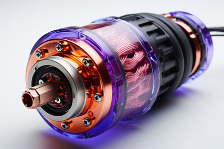 Highly detailed close-up of an electric motor showing intricate coils, connectors, and precision components.