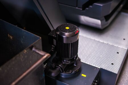 Industrial equipment blue hydraulic pump motor, blurred background. Coal industry
