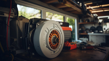 cylindrical three-phase electric motor and box with wires on blurred background, created with generative ai