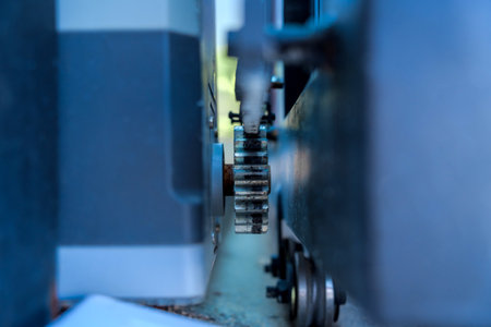 Detailed view of a complex machine with numerous interlocking gears in various sizes, working together to drive mechanical motion.