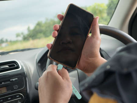 Navigator in car vehicle transportation commuter. Driver man using mobile phone navigator app while driving car. Hands on steering wheel