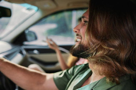 Young man driving a car with a smiling expression, showcasing a relaxed atmosphere The scene features a soft focus background