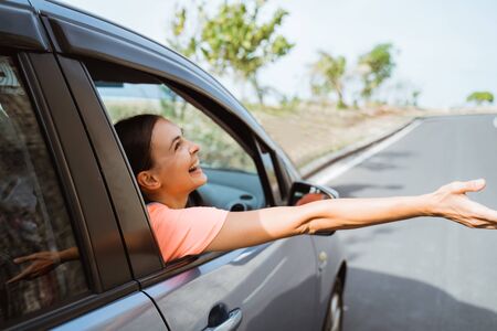 happy woman on the track peeking out of the car window in summer vacation and travel tourism