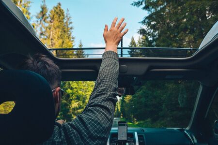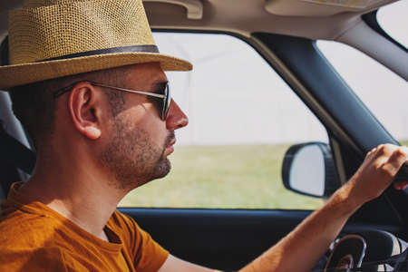 man driving a car at sunset-dawn, close-up, blur. Concept, road trips and travel, freedom of movement.