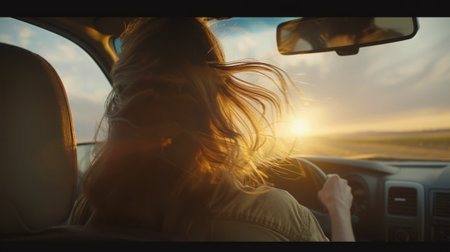 woman driving with the windows down, hair blowing, and music playing, generative ai