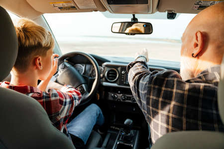 Happy middle aged father and his preschooler son sitting in a car driving car back view