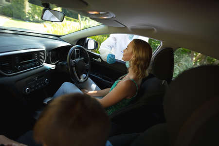 Medical worker wearing ppe suit taking swab tests of caucasian mother with son sitting in car. medical precautions, lifestyle during pandemic.
