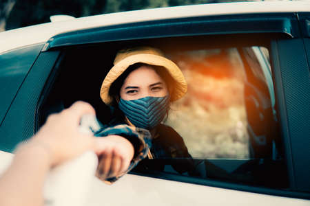 Woman cleaning a hand with 75% alcohol gel before driving through the screening to prevent Coronavirus or Covid-19