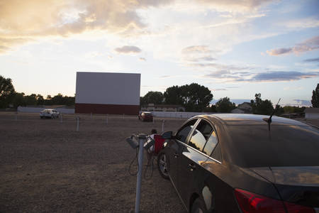 Empty movie screen at sunset, Star Drive In Movie Theater, Montrose, Colorado, USA