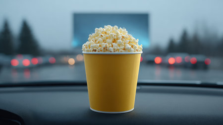A bright yellow cup filled with buttery popcorn sits on the dashboard of a car, ready for a fun movie night at a drive-in theater, evoking enjoyment and nostalgia.
