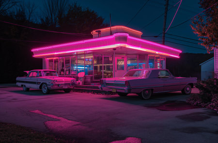 A vintage automobile is parked in front of a diner at night. The scene features illuminated neon signs, reflecting on the wet pavement. The image showcases a classic car, with vibrant colors, and a composition creating a retro atmosphere. Suitable for use in various commercial and editorial contexts.