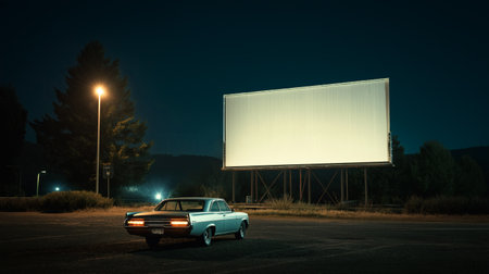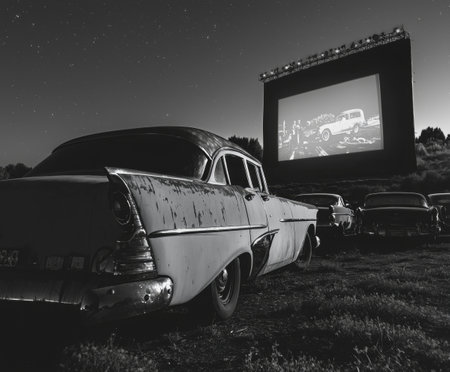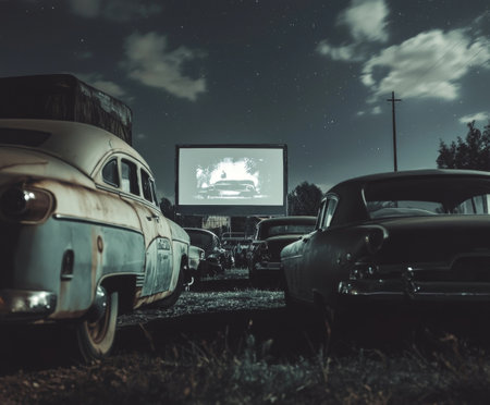 Vintage Drive In Theater in the Countryside at Night with Retro Classic Car An Abandoned Outdoor Cinema with Nostalgia and Atmospheric Scenery
