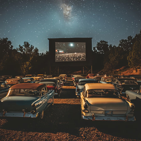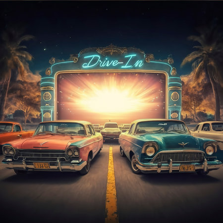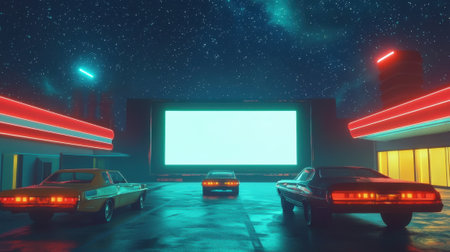 Retro themed Drive In Theater with Classic Cars Parked Under the Expansive Starry Night Sky and Milky Way Galaxy
