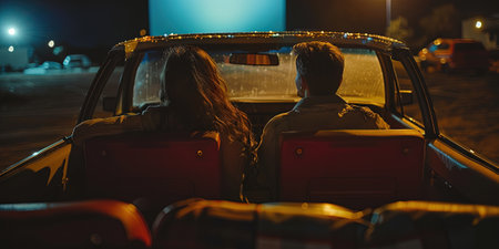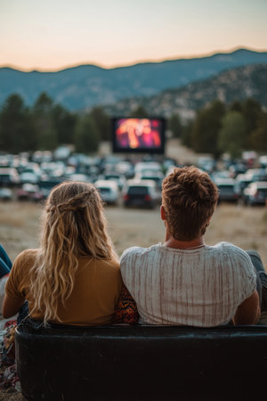 Couple Enjoying a Romantic Sunset Drive-In Movie Theater Date Under a Beautiful Sky Setting