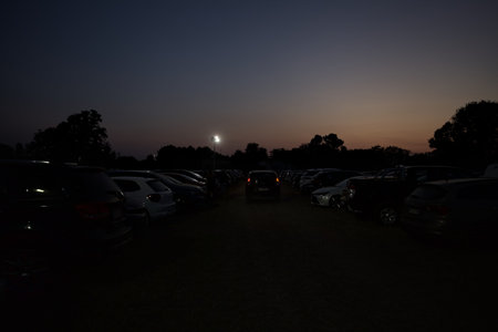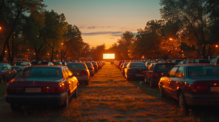 Evening Drive-In Movie Theater With Cars Parked Under Trees