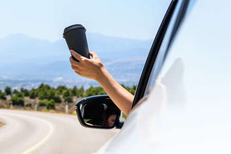 Woman driving a car holding paper cup of coffee from the open window. Trip on the serpentine road in the mountains. Summer vacation
