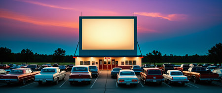 Atmospheric night view of an empty drive-in movie theatre featuring a vintage car facing a glowing blank screen, surrounded by soft lamplight and trees in the background.