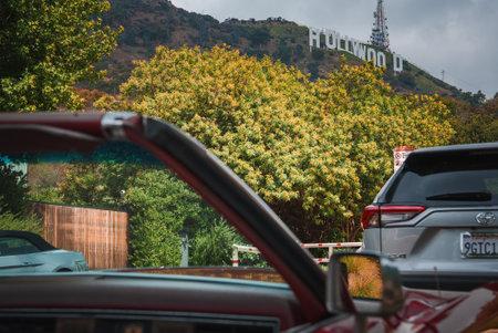 Red vehicle interior overlooks Hollywood Sign in Los Angeles