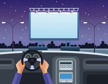Drive-in movie theater with cars on parking. Outdoor cinema for auto. Vector cartoon illustration of summer city landscape with open air cinema with blank screen and automobiles
