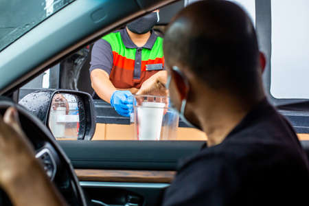 Selective focus to hand of staff wearing medical glove and mask to handed a food to customer. Drive thru and take away concept.