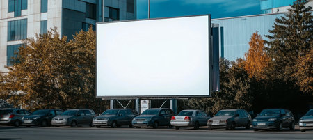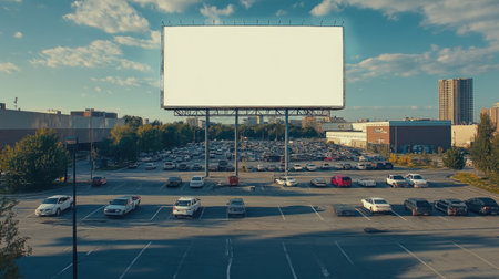 A spacious parking lot featuring an empty billboard under a bright sky. The scene captures a tranquil urban setting with surrounding vehicles and a distant cityscape.