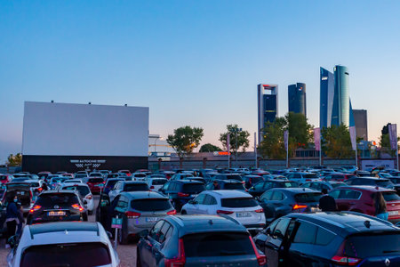 Madrid, Spain- April 17, 2021: Aerial view of summer cinema with the Madrid skyline on the horizon at sunset. Theme park. Summer cinema in Madrid