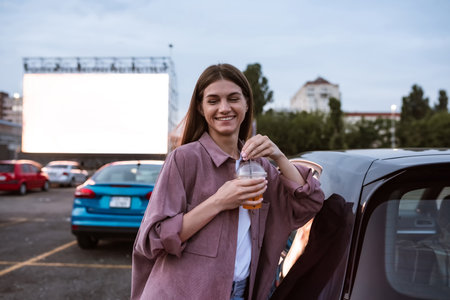 Portrait of three happy young friends smiling at camera while standing together by the car parked in front of a big screen to watch movies