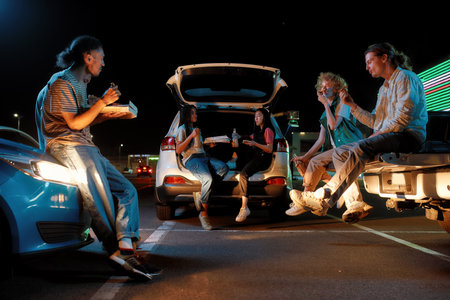 A group of young fashionably dressed friends of different nationalities sitting in opened car trunks in front of each other outside on a parking site eating pizza