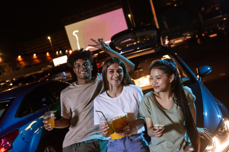 Portrait of three joyful young friends smiling at camera while having fun together, standing by the car parked in front of a big screen to watch movies