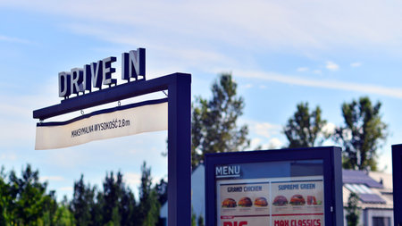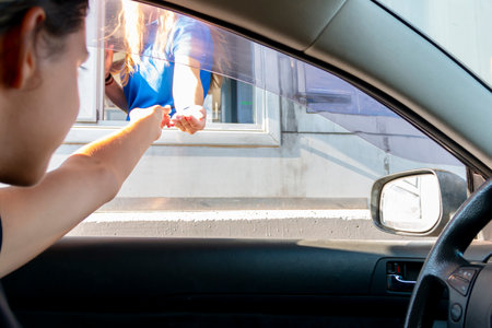 drive-thru with queue of customers waiting to be served, created with generative ai