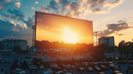 A stunning sunset illuminates the sky above a bustling cityscape, featuring a large billboard. The scene captures the vibrant colors of twilight and urban life.