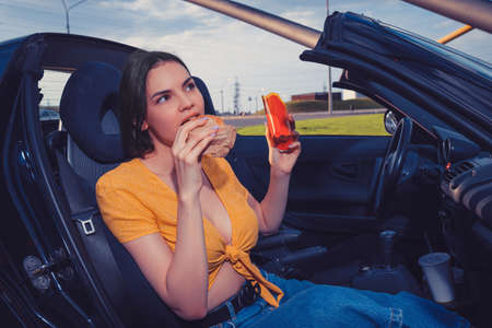 Female in blue jeans and orange top is eating hamburger and holding paper package with french fries while sitting in yellow car. Fast food. Copy space