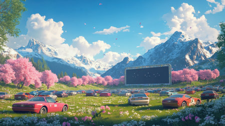 Cars are parked in a beautiful spring meadow for a drive-in movie experience. Surrounding mountains and blossoming trees create a picturesque setting, ideal for an outdoor film night.