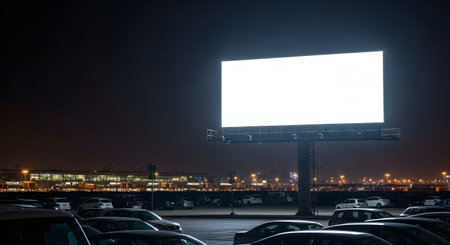 A large, brightly lit blank billboard stands prominently against a dark night sky, overlooking an empty parking lot with distant city lights.