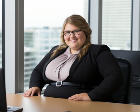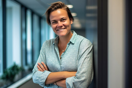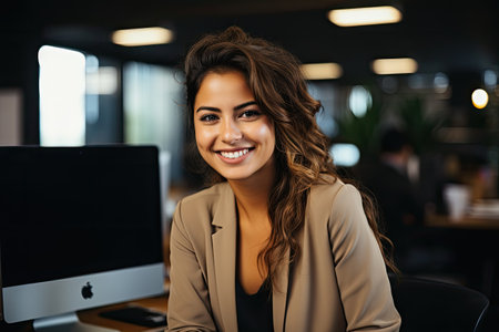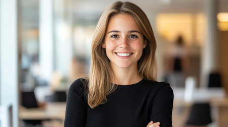 A confident young woman with a warm smile poses in a modern office environment. She exudes professionalism and positivity, making a great impression in any workplace setting.