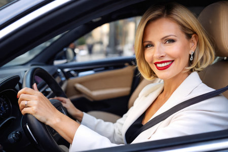 Stylish Business Woman Driving Modern Car in Urban Environment